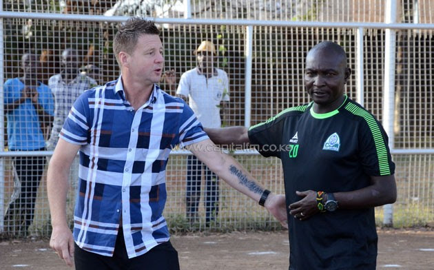 New Gor Mahia head coach Dylan Kerr with assistant coach Zedekiah Otieno at half time during their GOtv Shield match against Bandari at the Thika Stadium on July 9, 2017. PHOTO/Timothy Olobulu